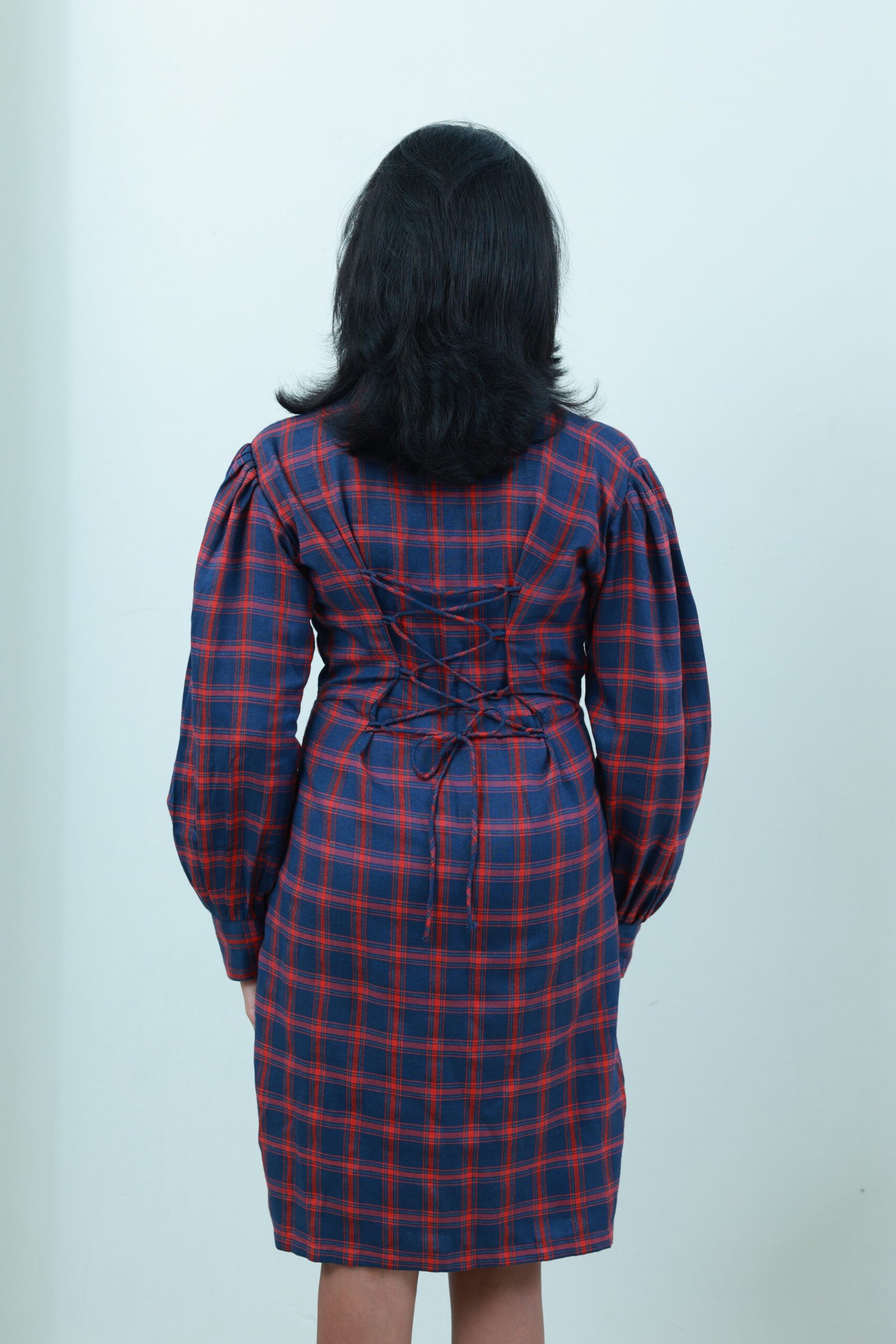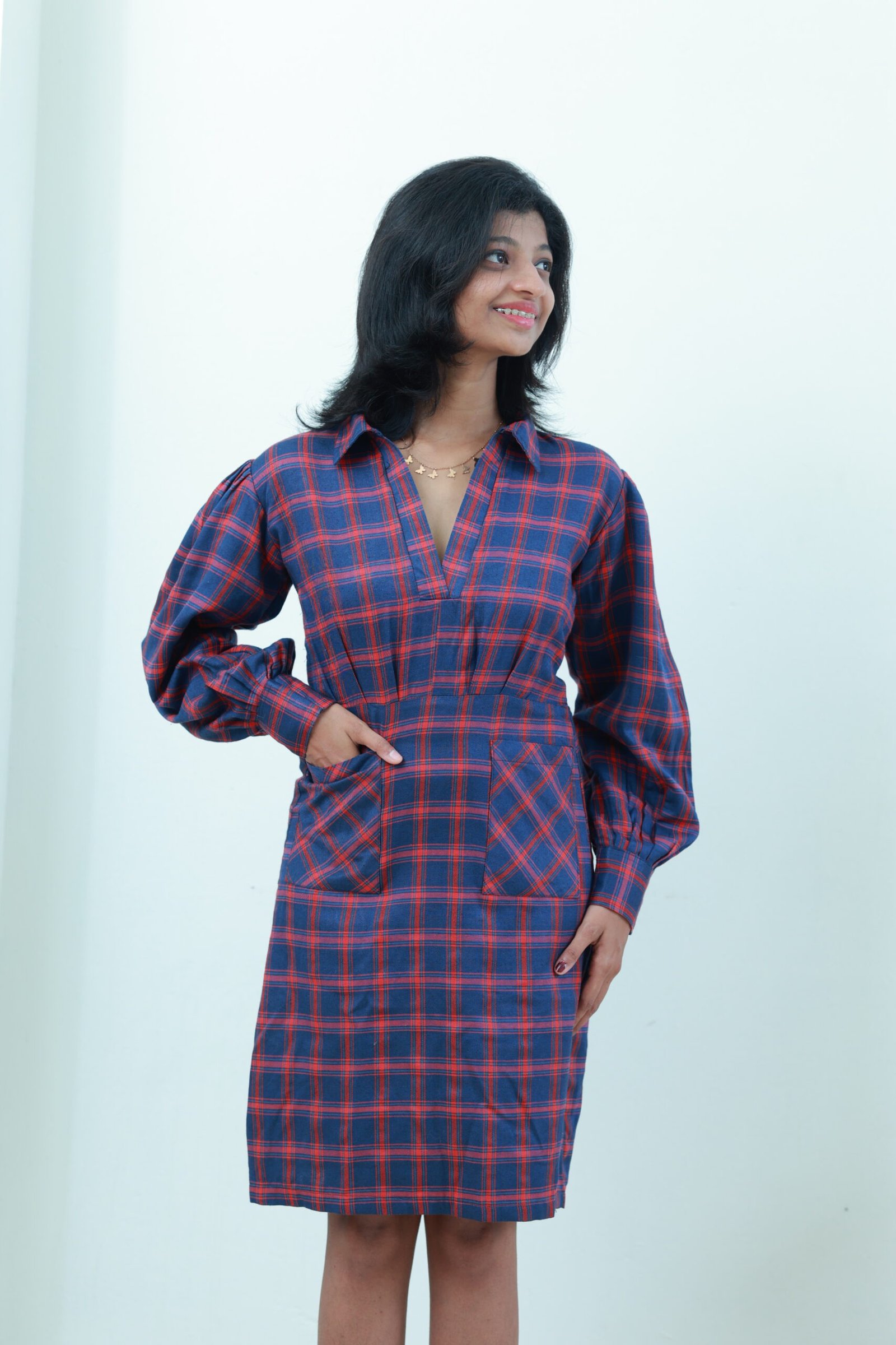 A playful yet polished dress in navy and red checks, designed with voluminous puff sleeves and a flattering V-neckline. The fitted waist and front patch pockets add both shape and function. Crafted from soft cotton-blend fabric, it’s comfy enough for all-day wear.