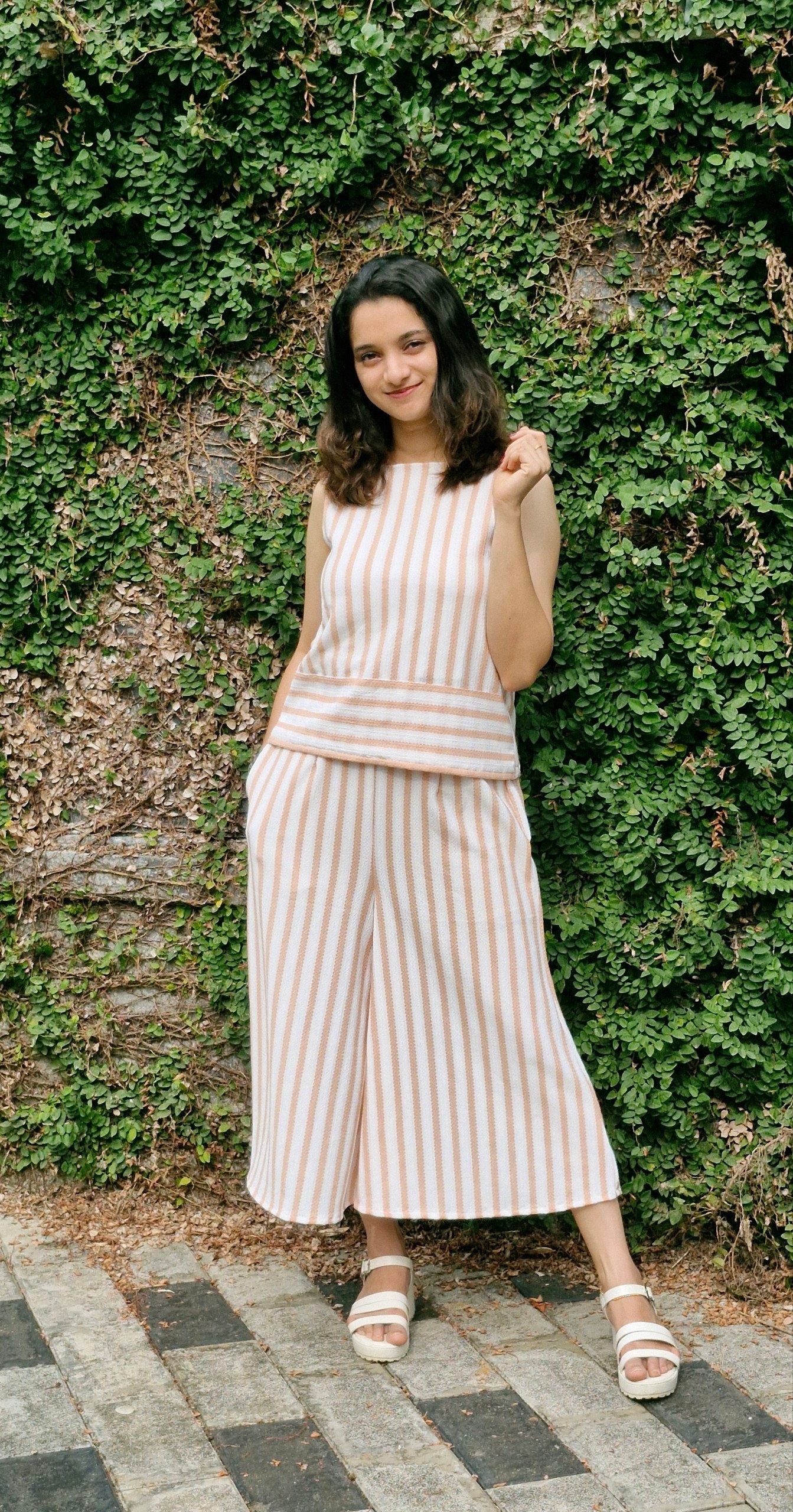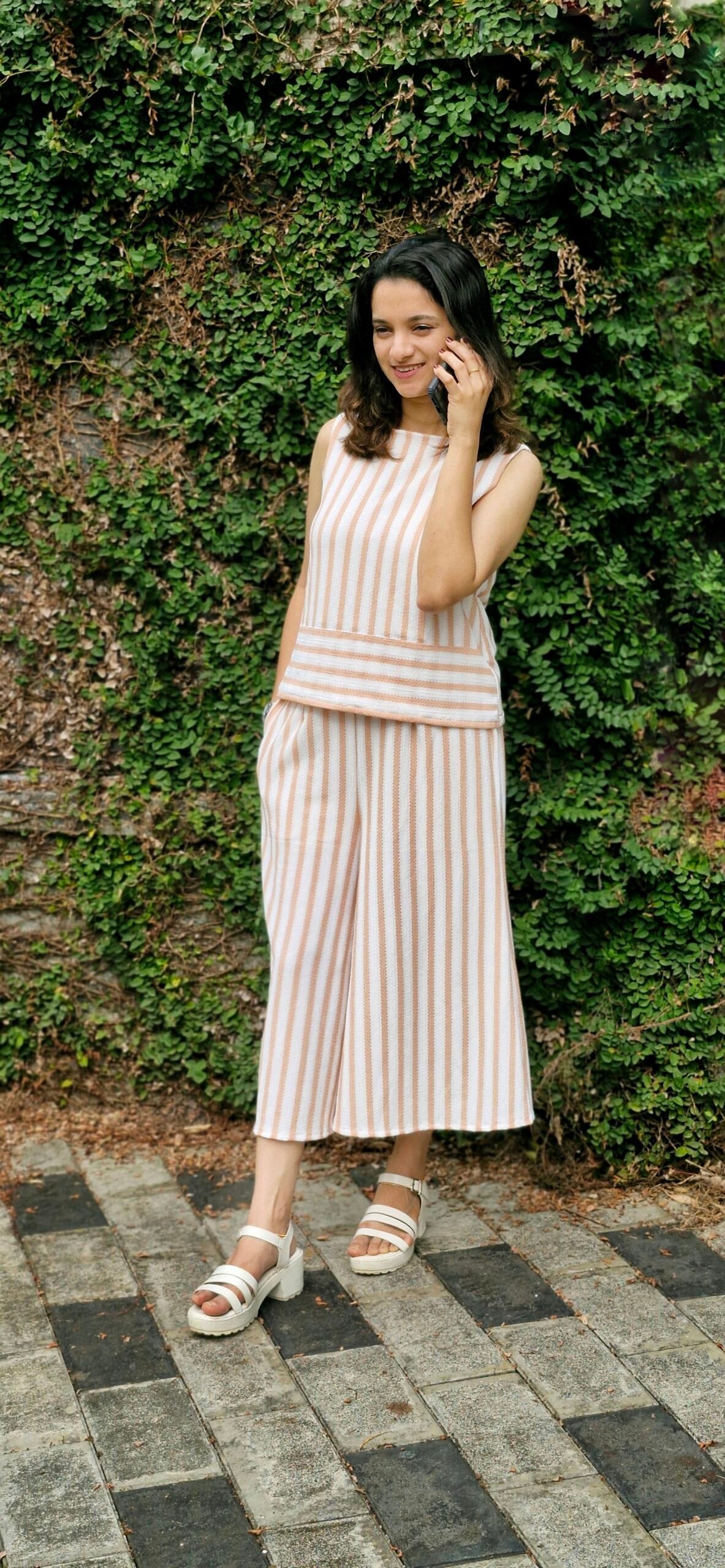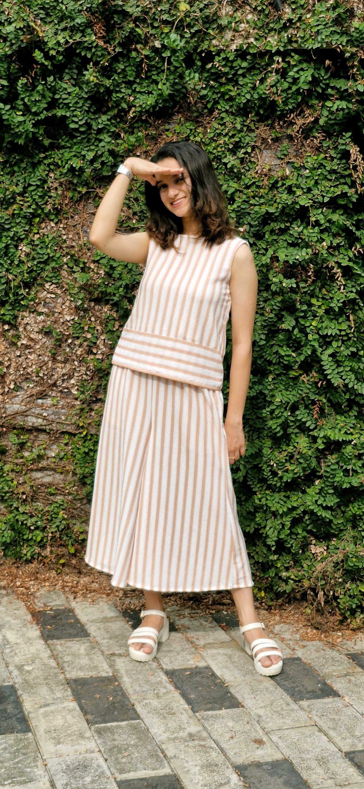Our chic sleeveless dress pairs a soft, stretchable fabric with cute peach-striped detailing. The culotte-style bottoms are midi-length, offering comfortable, breezy wear. Designed for all-day comfort, this dress feels soft and stretchy, delivering a cute, fashionable look perfect for everyday styling.