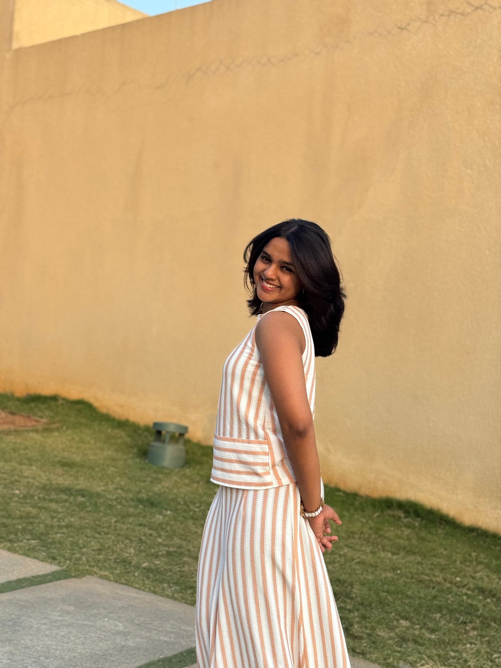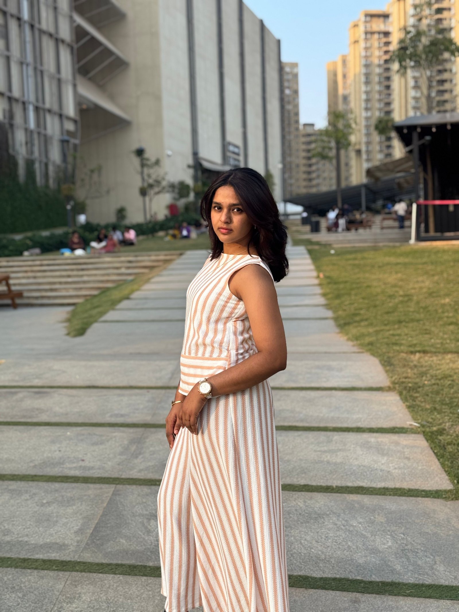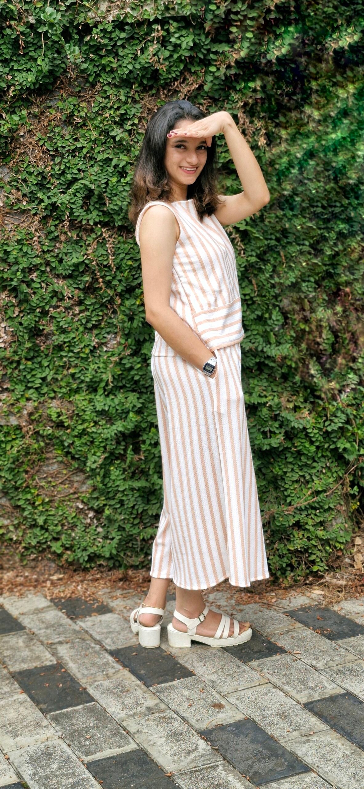 Our chic sleeveless dress pairs a soft, stretchable fabric with cute peach-striped detailing. The culotte-style bottoms are midi-length, offering comfortable, breezy wear. Designed for all-day comfort, this dress feels soft and stretchy, delivering a cute, fashionable look perfect for everyday styling.