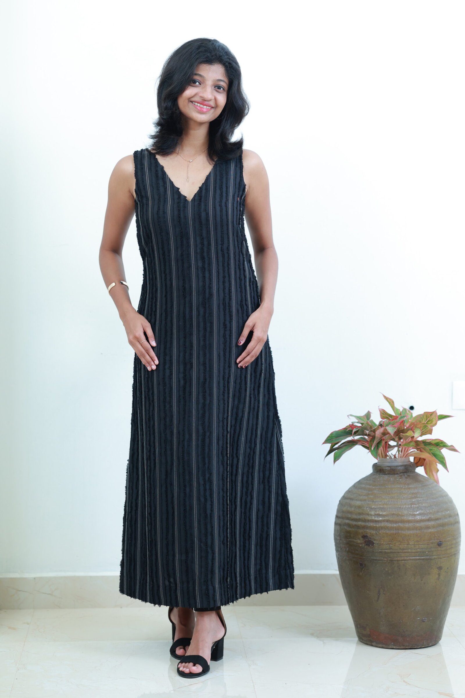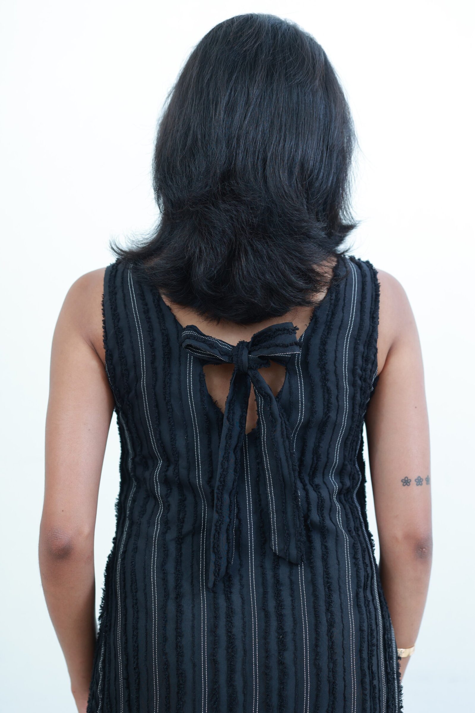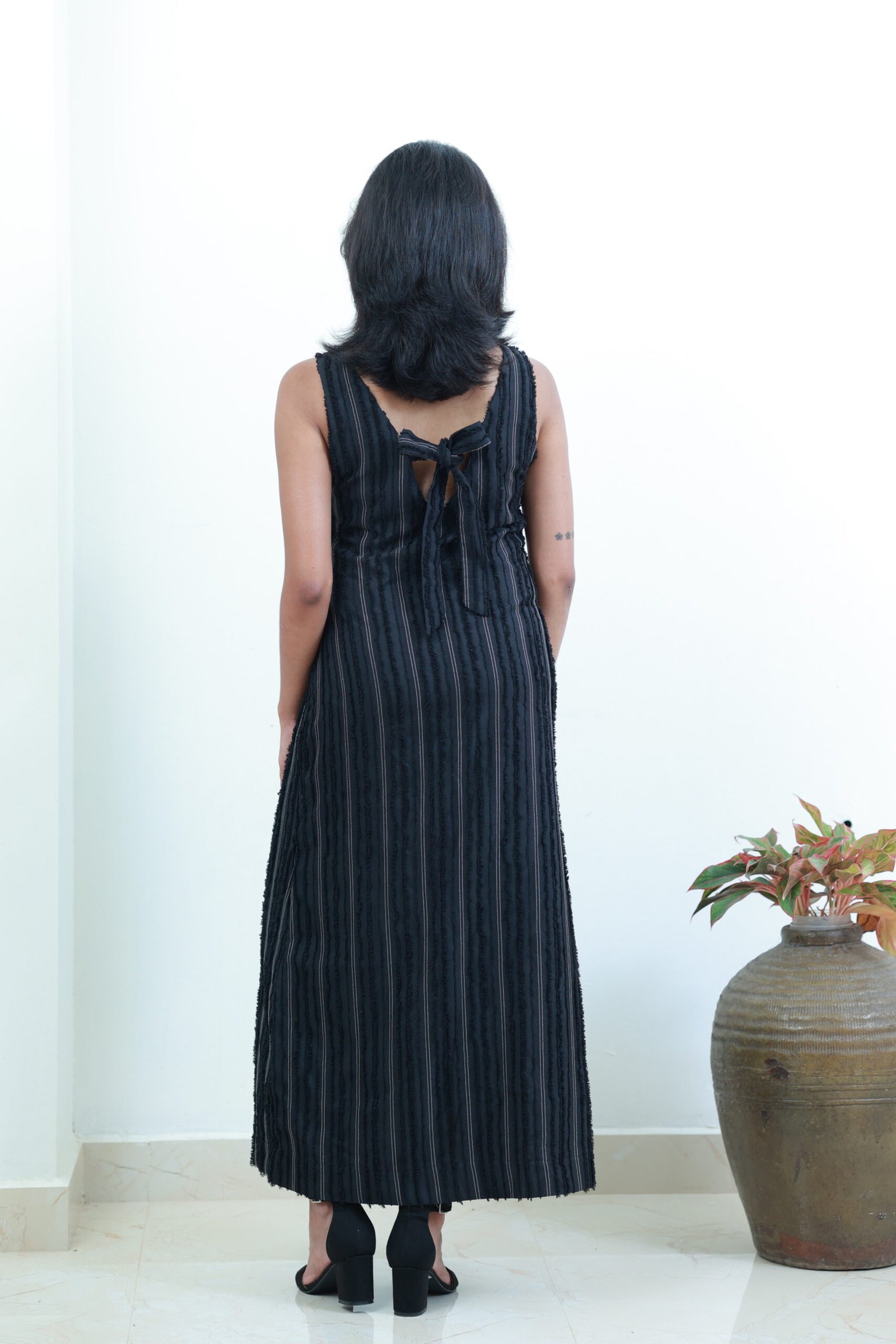 A maxi dress with vertical stripes and a soft back-tie detail. Lightweight and easygoing—perfect for casual day-outs and relaxed occasions.